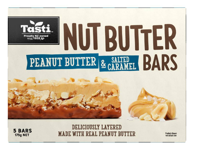 Peanut Butter & Salted Caramel Nut Butter Bars Ingredients Peanuts (25%), Peanut Butter Compound (25%) (Veget able Oil, Peanut Butter (5.5%), Maltodextrin, Pean ut Flour, Sugar, Salt, Emulsifier (Soy Lecithin)), Glucose Syrup, Milk Choc Compound (Sugar, Vegetab le Oil, Milk Solids, Cocoa Powder, Emulsifiers (So y Lecithin, 492), Natural Flavour), Rolled Oats, R ice Pops (contains Barley), Sunflower Oil, Humecta nt (Glycerol), Sugar, Natural Flavours , Salt, Emu lsifier (Soy Lecithin), Caramelised Sugar